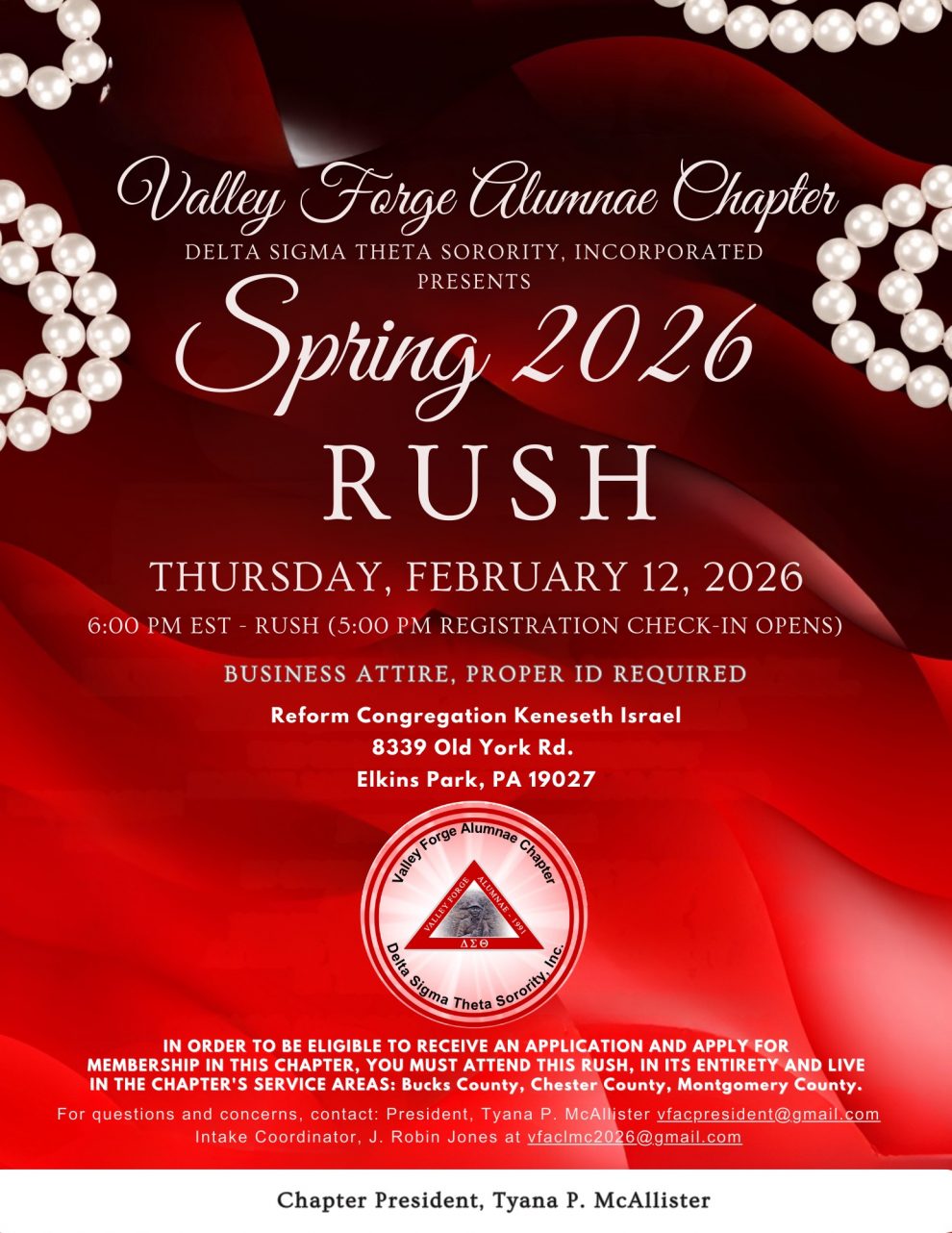Announcements Valley Forge Alumnae Chapter Spring 2026 Rush February 5, 20261,879 Views1 Min Read VFAC Admin Share This! Facebook Twitter Google Plus Pinterest LinkedIn About the authorView All Posts VFAC Admin Share This! Facebook Twitter Google Plus Pinterest LinkedIn Recent News & Posts Valley Forge Alumnae Chapter Spring 2026 Rush 2026 Scholarship Application VFAC on Instagram [http:// valleyforgedeltas “In the midst of all of life’s busyness, seek It’s National Giving Tuesday! ♥️📓📚🫱 Save the Date! ✨💫 May 4, 2025 🗓️ More d Happy Thanksgiving! 🦃🍁 Wishing you and your Our hearts are overflowing after an incredible wee Today is the day! Join us for our Love Exchange ev We had an AMAZING Delta GEMS and Delta Academy ses Let love comfort you and embrace you in this seaso #REPOST @dstinc1913 Congratulations to the outstan The Valley Forge Alumnae Chapter’s LEAD Program Sis, you do not always need a plan, sometimes you #REPOST @dstinc1913 Congratulations to the savvy, The Valley Forge Alumnae Chapter of Delta Sigma Th #REPOST @dstinc1913 Delta Sigma Theta Sorority, In 🏈 SOLD OUT! Our Crimson & Kream Kickoff fundrai Happy FORTITUDE FRIDAY! 🎉 The Valley Forge Alum Happy November birthday to the Sorors of the Valle #REPOST @dstinc1913 Delta Sigma Theta Sorority, In Dear Black Woman, You are beautiful. You are lo It’s Election Day, and Pennsylvania is a battleg Load More Follow on Instagram