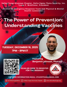 The Valley Forge Alumnae Chapter of Delta Sigma Theta, Inc. hosts “The Power of Prevention: Understanding Vaccines” on 12/16/25 at 7pm.